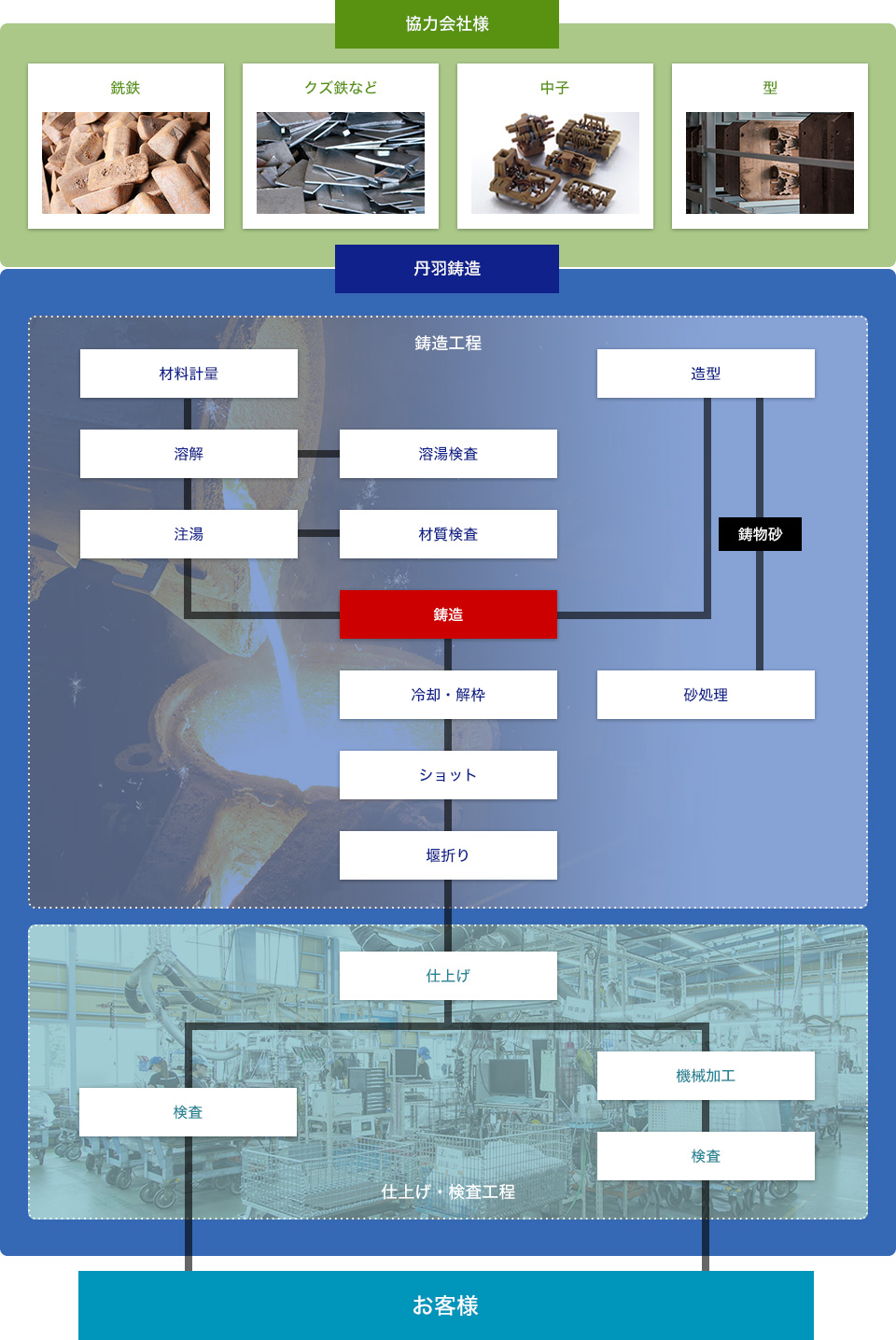 当社の仕事内容として鋳造工程の概要を紹介します。主に鋳造工程と仕上げ・検査工程に分かれています。